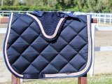Sottosella in tessuto trapuntato blu con doppia treccia di colore rosa e strass. Disponibile anche in coordinato con la cuffia per cavallo.